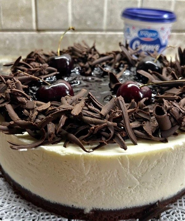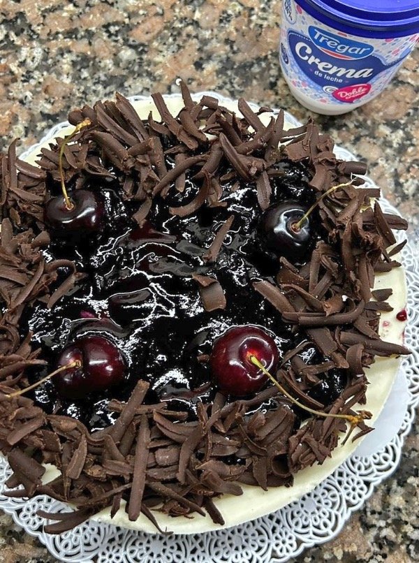 Biscuit de chocolate, crema de queso mascarpone @TregarOk , compota de cerezas, hilos de chocolate y cerezas naturales.